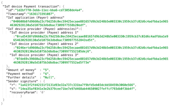 To support IoT device payment, we propose adding a novel IoT device payment transaction concept in the aGIDDI ontology and recording payment transaction logs based on this concept in the aGIDDI ledger. These permit aGIDDI to manage IoT device payments via the aGIDDI Blockchain. Figure 4 shows a sample IoT device payment transaction that includes the following attributes: transaction ID, IoT application or payer ID (e.g., the payer’s public key, PayPal ID, bank account), IoT device provider ID or payee ID/(e.g., the payee’s public key, PayPal ID, bank account, etc.), amount of money paid, method of payment (e.g., Bitcoin payment, PayPal payment, bank transfer), transaction timestamp, and payer authorization/signature. The method of payment is provided by the payee/IoT device provider and is used by the IoT device payment sub-service (which is discussed further in Section 5.3) to choose the appropriate payment service. The transaction ID is generated by IoT device payment sub-service that is discussed further in Section 5.3. Other transaction attributes (e.g., additional payment methods, currencies, etc.) can be easily included. By including, the IoT device payment transaction in aGIDDI ontology, the aGIDDI Blockchain can maintain a log of IoT device payment transactions and use that to permit IoT applications to integrate selected IoT devices.