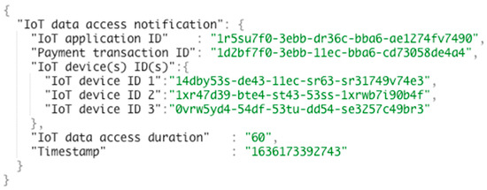 To maintain access to the IoT device data while the payment lasts, we have introduced the concept of IoT data access notification in the aGIDDI Ontology and aGIDDI records related access notification instances in the aGIDDI ledger. As illustrated in Figure 5, the IoT data access notifications include the following attributes: the IoT application ID, the payment transaction ID, the IDs of IoT device(s) the IoT application can access, the IoT data access duration or total number of data points, and the IoT timestamp of granting data access. The IoT application ID identifies the client IoT application. The payment transaction ID confirms a payment for accessing identified/listed IoT devices. The duration/total data point quota is used by IoT device access control sub-service (which is discussed further in Section 5.4) to control the access of the client IoT application to the listed IoT Device(s). The timestamp records the start of access to the data of the IoT devices listed.