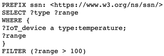 For this IoT device query example, the IoT device query sub-service generates the SPARQL query, as shown in Figure 6. When the query is executed, IoT device query sub-service returns a list of IoT devices that meet the IoT device search conditions and all public IoT device metadata that are available for each of these IoT devices.