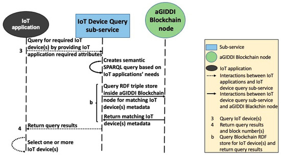 Step 2: IoT applications use the IoT device query sub-service to find the required IoT devices. The IoT device query sub-service expects POST request and JSON body including value name pairs for the needed attributes as represented by interaction 3 in Figure 8. The IoT device query sub-service creates a semantic query for finding the best match IoT devices based on IoT application needs. The IoT device query sub-service queries aGIDDI ledger inside the aGIDDI Blockchain node via RDF triple store semantically and obtains query results back, as we can see in interaction b in Figure 8. Then, it returns a list of IoT device metadata to the IoT application in order to select one or more IoT devices for integrating them (see interaction 4 from Figure 8).