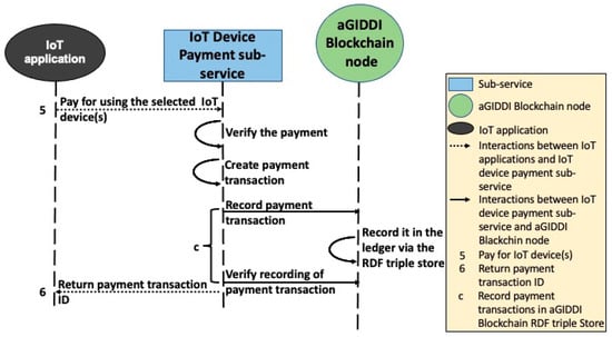 Step 3: IoT applications interact with the IoT device payment sub-service to pay for using the required IoT devices. The IoT device payment sub-service expects a POST request and JSON body including IoT application (payer) address, IoT device provider(s) (payee(s)) address(es), amount of money, the method of payment, payer signature/authorization, and other details may be required by different payment methods, as represented by interaction 5 in Figure 9. The sub-service allows IoT applications to pay by using different methods such as Bitcoin, PayPal, or credit card. The IoT device payment sub-service asks the IoT applications to authorize their payments by providing the card details, PayPal credentials, or digital signature. Then, the sub-service verifies the payment by contacting the authority that is responsible for the payment. Next, the IoT device payment sub-service creates ID and timestamp for the IoT device payment transaction and submits it to aGIDDI Blockchain node to be stored in aGIDDI ledger via RDF triple store. Once the payment transaction is stored successfully in aGIDDI Blockchain, the IoT device payment sub-service sends the IoT device payment transaction ID to the IoT application (see interaction 6 from Figure 9) to be used later for obtaining the IoT device integration permit from the IoT device access control sub-service.