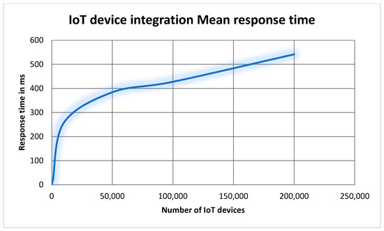 We observed that the maximum response time of integrating IoT devices happens when many IoT device integrations are processed at the same time, which reduces the performance of IoT device access control sub-service and IoT data-fetching and -forwarding sub-service.