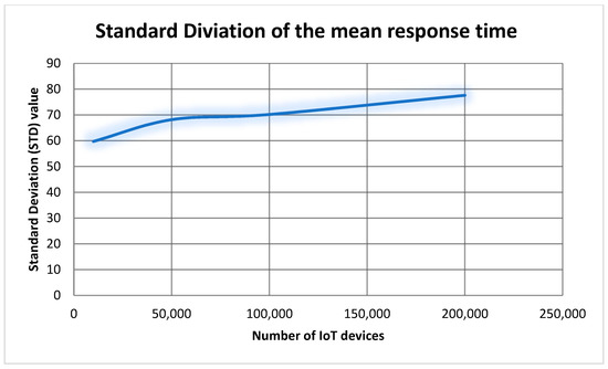 This experiment conducted several tests to evaluate the mean response time and maximum response time of integrating simulated IoT devices. The results of the six test outcomes are presented in Table 2. As we can see from Table 2 and Figure 12, the mean response time increased gradually with respect to the increasing of IoT devices. Additionally, we did not face a breaking point when the number of IoT devices increased. That means aGIDDI is capable to handle large number of IoT devices without majorly impacting the mean time response. Although the mean response time of integrating IoT devices shows acceptable results, we need a statistical method to evaluate the response time of integrating IoT devices. Therefore, we use standard deviation (SD) to measure the amount of variation of the response time. From Table 2 and Figure 12 and Figure 13, we can clearly see that the relation between the mean response time and its SD is linear with respect to increasing the number of IoT devices. At 100 IoT devices, the mean response time is 2ms and the SD is 1.82, which means 68% of IoT device integration requests were processed in a range of mean response time ± SD (i.e., 0.18 ms to 3.82 ms). Additionally, at 200,000 IoT devices, the mean response time is 541.5 ms and the SD is 77.59. That means 68% of IoT device integration requests were processed in a range of 0.46 s and 0.61 s. That means the variation of the mean response time is low and it is not likely to be impacted by increasing the number of integrated IoT devices. Furthermore, the SD numbers from Table 2 indicate that the maximum response time happened for less than 1% of the total IoT device integration requests because 99% of the integration requests through the experiment were from a range of mean response time ± 3SD. Finally, we can indicate from Table 2 that the size of aGIDDI Blockchain is increasing with respect to the number of IoT devices registered (i.e., IoT device metadata stored in aGIDDI Blockchain).