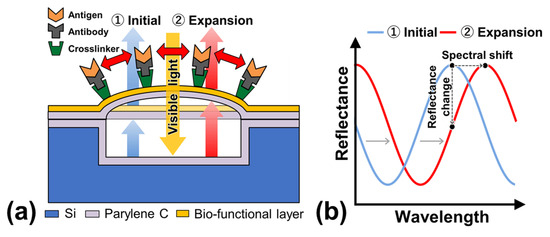Figure 1a displays a schematic diagram of the cross-sectional structure and detection principle of the optical interferometric surface-stress sensor. The proposed sensor was composed of a parylene-C nanosheet with a bio-functional layer to represent the deformable membrane on a cavity that was formed on a Si substrate; therefore, the FPI was composed of a deformable membrane, air gap, and Si substrate. The antigen-antibody binding deformed the membrane due to repulsive forces between the charges of the bound antigen. When the deformable membrane was deflected by the surface stress, the distance between the Si substrate and the deformed membrane increased, thereby causing a spectral shift to the longer wavelength (Figure 1b). Therefore, the nanomechanical deflection of the deformable membrane could be evaluated by observing the reflection spectral shifts. Since the deflection amount of the surface-stress sensor is inversely proportional to the Young’s modulus of the material of the moving part and the thickness of the film, the detection sensitivity can be improved using a soft material with a low Young’s modulus and a thin film [29,30]. In this study, parylene-C was utilized as a support layer of the freestanding membrane since its Young’s modulus is two orders of magnitude lower than that of Si, and its uniform nanosheets of submicron thickness can be easily obtained by chemical vapor deposition at room temperature (25 °C) [31].