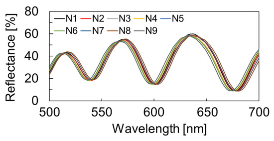 The measured reflection spectra of the FPI sensors that were fabricated by nanosheet transfer process. A sensor array with a uniform airgap with a variation of up to 33 nm was formed. N1-9 represent the nine measured FPI sensor elements.