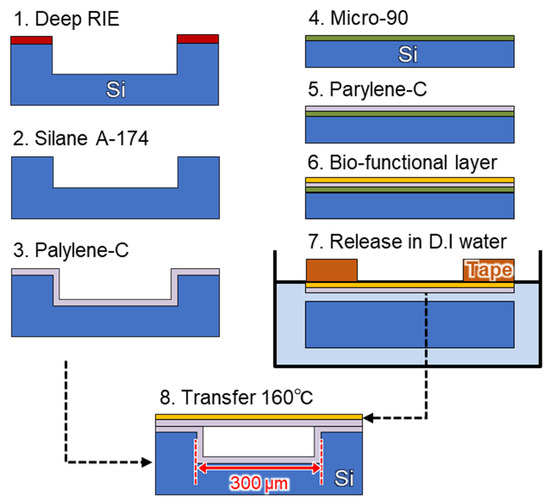 Fabrication procedure for the microelectromechanical system (MEMS) optical interferometric surface-stress immunosensor. (1) Preparing the silicon substrate with micro-cavity structure by deep reactive ion etching (RIE). (2) Silane-coupling treatment using a mixture of deionized water (DIW), isopropyl alcohol (IPA), and γ-methacryloxypropyltrimethoxysilane (A-174) in a ratio of 100:100:1. (3) Deposition of parylene-C for a binder layer using a parylene deposition system. (4) Spin-coating surfactant (Micro-90 2%) on a two-inch silicon substrate. (5) Deposition of parylene-C for a transfer sheet. (6) Formation of a bio-functional layer on the parylene-C layer. (7) The parylene-C nanosheet with the bio-functional layer supported by Kapton tape was released from the silicon substrate in DIW. (8) The released nanosheet was transferred onto the silicon substrate with binder parylene-C and heated at 160 °C for 1 h on a hot plate. Finally, it was cut into 2.5 mm × 2.5 mm sizes using a laser dicing machine.