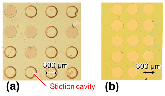 Chip photograph after molecular modification using (a) a PMMA film and UV irradiation and (b) an amino-functionalized parylene (diX-AM) layer and glutaraldehyde cross-linking. The defective rate of deformable membrane was decreased.