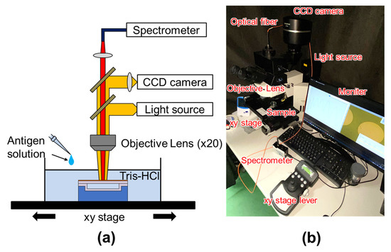 In our previous study [30], we measured the reflection spectrum of an anti-HSA modified PMMA layer that was treated with an HSA antibody on a deformable membrane (Figure S1a), and successfully detected 1 fg/mL HSA antigen. To modify the surface of the deformable membrane with biomolecules, the surface of the PMMA was oxidized to form carboxyl groups using UV/O3 treatment [33]. The UV/O3 treatment was carried out at room temperature at 25 °C with the flow rate of O2 at 0.5 L/min. For crosslinking between the antibody and the membrane surface, 1-ethyl-3-(3-dimethylaminopropyl) carbodiimide (EDC) 5 mg/N-hydroxysuccinimide (NHS) 1.5 mg in 1 mL of 2- (N-morpholino) ethane sulfonic acid (MES buffer) was used. It was performed for 30 min to bind the amino groups of the antibody. For antibody immobilization, the chip was dipped into a 10 μg/mL solution of anti-PSA antibody in phosphate-buffered saline (PBS) for 2 h. To prevent nonspecific adsorption, it was immersed in 100 μg/mL bovine serum albumin (BSA) for 2 h as a blocking agent.