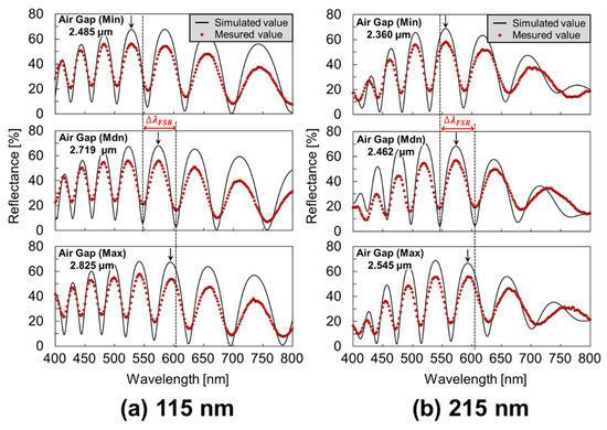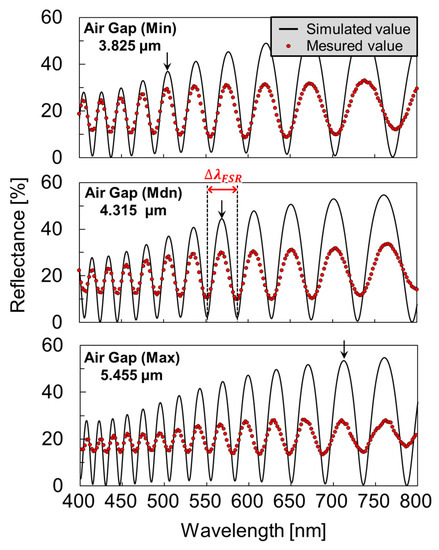 In optical interferometric sensors, the amount of spectrum shift that is associated with membrane deflection depends on the initial air gap [32]. Therefore, if the initial air gap varies from cavity to cavity, the signal conversion efficiency for membrane deflection at the gap expansion will be different for each sensor. In a previous study [30], FPI sensors that were as close as possible to the standard optical interference spectrum were selected for immunosensing. However, considering future multi-cavity measurements by arraying, reducing this variability is crucial to obtain a more accurate measurement. The tolerance of the variation can be discussed using the free spectral range (FSR) of the interference property. FSR () is the spacing in the optical wavelength between two successive reflected or transmitted optical intensity maxima or minima of an interferometer. It is calculated using the following equation: