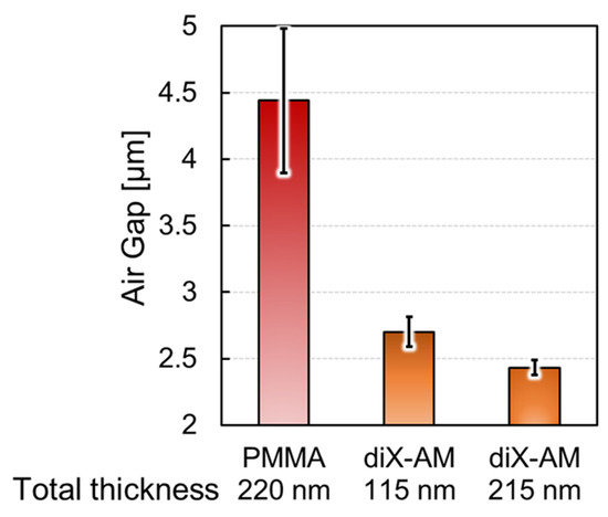 Comparison of the airgap variations that represent variations in the deformed membrane shape by applying the receptor modification method for oxidized poly methyl methacrylate (PMMA) and diX-AM. The airgap variation of the diX-AM coated sensors decreased to 1/5 to 1/10.