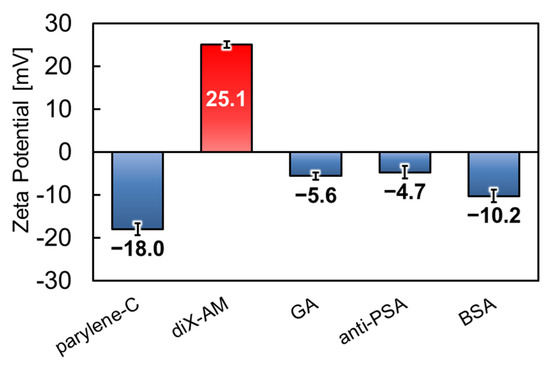 Figure 9 presents the results of the five surface conditions, namely parylene-C, diX-AM, GA, anti-PSA, and BSA, respectively, at each stage with three measurements. The error bars indicate the standard deviations. In the pristine parylene-C layer, the surface zeta potential was −18.3 mV, which is consistent with the values of other studies [42,43]. When diX-AM was deposited on parylene-C, the zeta potential reversed and increased to +25.1 mV. This was probably due to the contribution of the amino groups on the diX-AM surface. Since the zeta potential of the amino-functionalized particles has been found to yield 10–40 mV in the pH range of 6–7 [44,45], a positive change was considered appropriate. Since the polarity of the zeta potential was reversed, it is considered that the surface of parylene-C was covered with diX-AM with a thickness of 10–20 nm. After GA treatment, the measured value was −5.6 mV. Since GA has no dissociating group, the surface loses its polarity when the amino group of diX-AM is terminated [46,47]. Therefore, GA cross-linking was expected to decrease the zeta potential. When anti-PSA was cross-linked by GA, the zeta potential was −4.7 mV. Since anti-PSA, with an isoelectric point of around 5.5~6.0 [48,49], is expected to be negatively charged in a solution at pH 6.87, the result was appropriate. Finally, after the blocking treatment with the BSA solution, the zeta potential decreased to −10.2 mV. The isoelectric point of BSA is approximately 4.7~5.1 [50,51], which is lower than that of the anti-PSA. Therefore, when BSA adsorbs specifically to residues of GA or non-specifically to unterminated amino groups, the zeta potential is expected to move further in the negative direction. In summary, the zeta potential for each process is consistent with the intended molecular binding. In addition, the AFM images suggested that molecules such as antigens, antibodies, and cross-linking agents were adsorbed on the surface using the proposed modification protocol. (Figure S3) Therefore, the new protocol using diX-AM and GA cross-linking, which is less invasive than the previous study’s method using PMMA and EDC/NHS cross-linking, could also form a biosolid interface for selective adsorption of antigens.