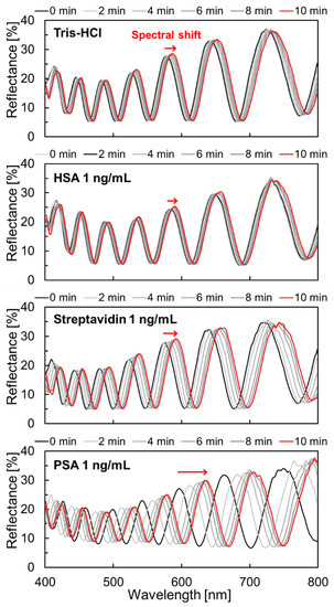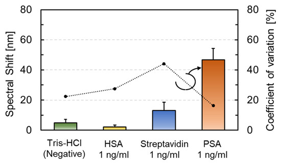 Figure 11 displays the difference in the amount of spectral shift for dropping each solution. Each data point represents the average value (N = 9 or more), and the error bars indicate the corresponding standard deviation. The spectral shifts that were treated with the Tris-HCl buffer (negative control), HSA, Streptavidin, and PSA were 4.9 nm, 2.2 nm, 13 nm, and 46.6 nm, respectively. Although the amount of spectral shift of Streptavidin was larger than that of Tris-HCl as a negative control, it was only 1/4 of the response when compared with PSA, thereby confirming the difference between the specific and non-specific adsorption.