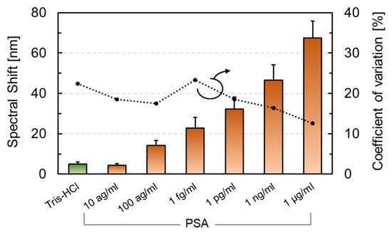 Figure 12 displays the spectral shift depending on the PSA concentration. The concentration of the PSA solutions was adjusted to final concentrations of 1 fg/mL, 1 pg/mL, 1 ng/mL, and 1 µg/mL. Thereafter, 0.1 mL solutions were added dropwise to the buffer solution in which the sensor chip was immersed. The average spectral shifts (N = 9 or more) that were treated with the buffer solution and the PSA solution at a concentration of 10−17, 10−16, 10−15, 10−12, 10−9, and 10−6 g/mL were 4.9 nm, 4.4 nm, 14.1 nm, 22.9 nm, 32.2 nm, 46.6 nm, and 67.4 nm, respectively. The amount of spectral shift increased with antigen concentration. Furthermore, there was a significant difference at the 100 ag/mL concentration compared to the negative control using Tris-HCl. This result was 2,000,000 times lower than that of the static-type microcantilever, and it exhibited the highest sensitivity for PSA detection among the label-free biosensors that were based on semiconductor microfabrication technology (Table 1).