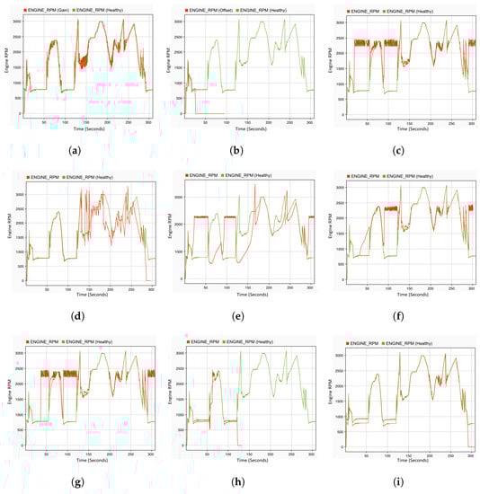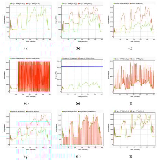 In order to implement the FI method, three main configuration fault dimensions must be defined, i.e., fault type, fault location and injection time, which, together, form a fault space. According to the literature, there are several types of potential faults in the time series data, such as gain, offset/bias, noise, hard-over, spike, stuck-at, packet loss, delay and drift faults [,,]. By analyzing the signal features that characterize automotive fault behavior, the authors of [] categorized the common faults in the vehicle’s PCM signals, such as abnormal magnitudes, rolling, noise and dependency faults. In addition, they also named some direct and indirect causes of the defined faults. Dirty or deteriorated sensors, faulty vehicle components, vibrations caused by dangerous internal motors, and sudden acceleration are good examples of direct sources that can cause these types of faults. Conversely, bumpy roads and uncertainties in driving behavior can cause anomalies in signal behavior without necessarily provoking faults.