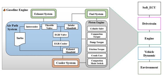 To demonstrate the applicability of the proposed framework, the ASM gasoline engine model from dSPACE [] is used as a case study. Figure 6 shows the system architecture of the gasoline engine designed in the MATLAB/Simulink environment. It consists of several systems and subsystems, i.e., SoftECU, gasoline engine, powertrain, vehicle dynamics and environment. In addition, there are I/O blocks for simulation and management of signals to the real hardware ECU. SoftECU provides the simulation of controller algorithms. Thus, the plant model can either contact the real target ECU (online mode) or receive controller commands from SoftECU at the simulation level (offline mode). The gasoline engine has been modeled in detail to include all physical characteristics of the engine. Air path system, fuel system, piston engine system, exhaust system and cooler system are the main parts.