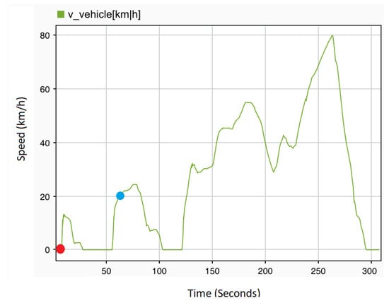 To configure the driving scenario, the driving cycle is selected from the list provided by dSPACE in controlDesk. The driving mode is set to automatic with the predefined vehicle speed. Figure 9 shows the selected drive cycles in dSPACE ControlDesk. The red dot represents the starting point and the blue dot the current location. The cycles can be changed according to the tester’s requirements. Key specifications for the HiL experiments in order to perform the aforementioned driving scenario are given in Table 4.
