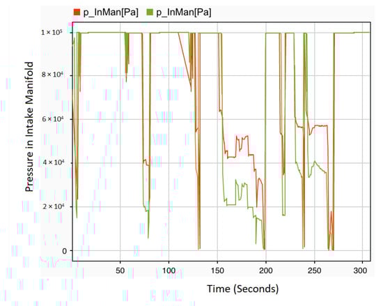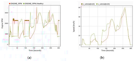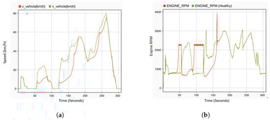 Since transient faults occur much more frequently than permanent faults, with more difficulty in detection, this study highlights the effect of this type of fault on the dynamic behavior of the complex automobile system. To this end, the stuck-at fault with and values of 0 as a transient fault is injected into the engine speed sensor for a period of 160 s at 40 s. Figure 14 shows the effect of the fault on the system behavior, where the stuck-at fault with and values of 0 (1) as a transient fault is injected into the engine RPM sensor. The time period of the transient fault is from 40 to 160 s. The result shows that the effect is similar to the effect of a permanent fault. However, when the fault is revoked, a sharp increase in both the engine RPM (Figure 14b) and vehicle speed (Figure 14a) at a time of 160 s is observed. Once the fault is deactivated, the system behavior returns to a normal state and continues with the fault-free mode.