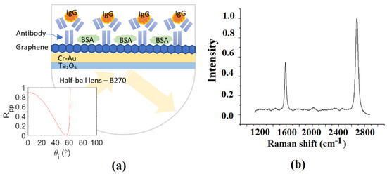 In the graphene-coating process, graphene was grown on a Cu substrate and then transferred to the half-ball lens sensor by placing it in light contact with the surface of the Cr-Au thin film. The graphene was coated on the Cu substrate using the chemical vapor decomposition (CVD) method described in [39]. Briefly, 4 g of PMMA powder was dissolved in 100 mL of anisole (99%, A12997, Alfa Aesar) in a brown jar. The solution was stirred magnetically at 50 °C in a water bath for 6 h, and was then spin-coated onto the Cu substrate at 600 rpm for 6 s and 4000 rpm for 30 s. The Cu substrate was etched in a CuSO4: HCl:water solution (10 g:50 mL:50 mL) for 20 min and was then soaked in deionized (DI) water for 10 min and rinsed to wash the deionized water away. The sensor was baked at 100 °C for 20 min, and was then soaked three times in acetone at room temperature to remove the PMMA (note that the soaking times were 3, 5, and 5–10 min, respectively. Finally, the sensor was placed in an oven and dried at 50 °C for 10 min. Figure 1b presents the Raman spectroscopy analysis results for the graphene layer of the SPR sensor. Two prominent peaks were observed at 1600 cm−1 and 2700 cm−1, respectively, which confirmed that the graphene layer consisted of a single layer of carbon atoms on the Cr-Au surface [40].