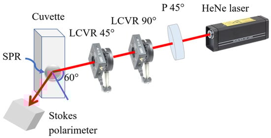 In this study, the Stokes–Mueller polarimetry system constructed in the previous study [36] was employed. The illustration schematic of the system is shown in Figure 2. As shown, the main items of equipment included a 633 nm He-Ne laser (1135P, JDS); a polarizer (GTH5M, Thorlabs Inc., Newton, NJ, USA) with the principal axis angle adjusted to 45°; two liquid-crystal variable retarders (LCVRs) (LCC2415VIS/M, Thorlabs Inc., Newton, NJ, USA) with slow axis angles of 90° and 45°, respectively; and a Stokes polarimeter (PAX1000VIS, Thorlabs Inc., Newton, NJ, USA).