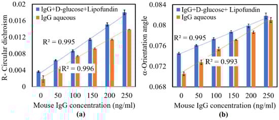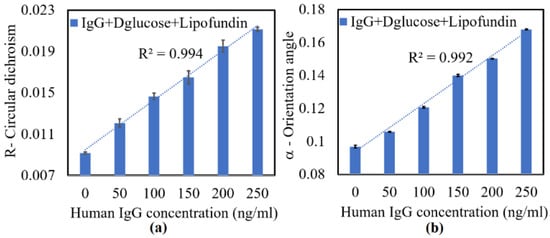 Figure 4 shows the experimental results obtained for the circular dichroism (R) and principal fast axis angle (α) of the various samples. As shown in Figure 4a, R increased linearly with the IgG concentration with a coefficient of determination of 0.994 over the considered range of 0–250 ng/mL. Similarly, as shown in Figure 4b, α increased linearly with increasing IgG concentration with a coefficient of determination of 0.992. The average standard deviation values of R and α over five repeated tests were found to be 3.6 × 10−4 and 4.6 × 10−4 deg, respectively. Based on the measured values of R, the sensitivity of the measurement results was determined to be = 6 × 10−5 units of R/(ng/mL). The resolution of the measurement results was thus found to be = 6.5 ng/mL, where is the average standard deviation of the measured CD value. Based on the measured values of α, the sensitivity of the measurement results was determined to be = 4.8 × 10−5 unit of R/(ng/mL), while the resolution was found to be = 8.1 ng/mL. Thus, as in the mouse IgG samples, the CD measurements provided a better resolution performance than the LB measurements because the polarization absorption were enhanced by the SPR sensor.
