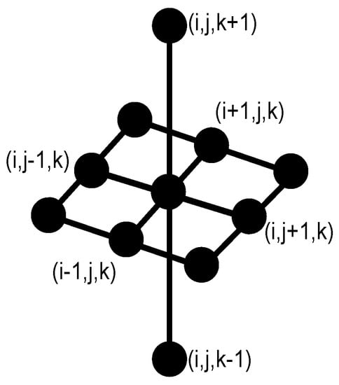 Figure 1 shows the elementary structuring element in 3D containing its origin used in this study. denotes the transposed set with respect to its origin, and is a homothetic parameter. The morphological opening, closing, erosion, and dilation transformations are expressed as, , , , and , respectively [28]. Furthermore, the opening and closing by reconstruction propagate a marker to filter components by size without introducing new contours [29], where represents the reconstruction transformation.
