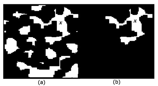 Punctual opening. (a) Original image X and the marker x; (b) The punctual opening extracts the component where marker x is located.