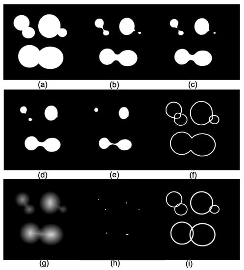 The number of connected components depends on the viscosity parameter . Figure 3a displays the original image composed of three arcwise-connected components or three components at viscosity . Figure 3b–e show the eroded images using disks of sizes 20, 22, 27, and 36. Then, at viscosity = 20, there are 4 connected components, whereas, at viscosity = 22, the image has 5 connected components, as exemplified in Figure 3b,c. The image in Figure 3f presents the connected components for viscosity . However, by considering disks as the elementary shapes of the image, it is not possible to detect six connected components for any viscosity. The solution to this problem is to select the connected components at different viscosities (scales), and one option is the traditional algorithm known as ultimate erosion. This consists of choosing the connected components at a specific viscosity , such that the viscosity will remove them. Another method to select the connected components is to compute the distance function, as shown in Figure 3g, and detect their maxima. The image in Figure 3h contains the ultimate eroded components for viscosities (sizes), and 68. Figure 3i illustrates the connected components in the viscous lattice sense. Viscous connectivity is interesting because it exploits the goal in binary image segmentation, which consists of splitting the connected components into a set of elementary shapes.