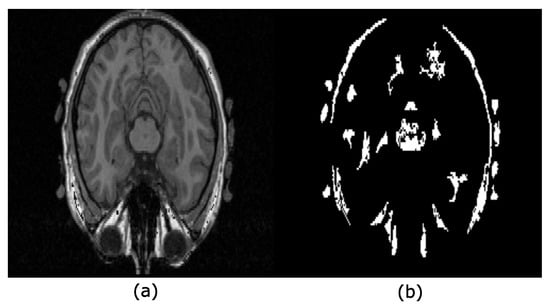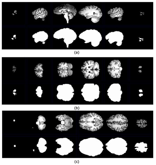 Magnetic resonance imaging (MRI) allows the noninvasive assessment of the patient, and it is useful for early diagnosis, medical monitoring, and the detection of many diseases, such as Alzheimer’s disease, brain aneurysm, brain tumor, and melanoma of the eye [1]. However, there are many applications related to brain imaging that require accurate brain segmentation to separate the skull, scalp, dura, eyes, etc. This procedure is known as skull stripping [2,3]. Several applications of brain segmentation include brain volume estimation [4], image registration [5], automatic tumor detection [6], the first state in cortical flattening procedures [7], and structural studies [8,9,10].