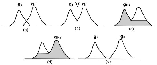 Figure 5 exemplifies this situation. Figure 5a shows two overlapping functions, and . For the MRI case, represents a maximum on the brain, and is a maximum on the skull; however, the regions under the intersection of both functions indicate that the brain and the skull overlap, i.e., they are connected or hyperconnected. Figure 5b illustrates the supremum between and . Note that it is not possible to recover or from . This is what we visualize in reality; our eyes would observe how the brain and the skull appear in two places in a certain slice; nevertheless, lower slices connect them.