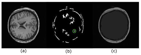 Hyperconnected functions. (a) Original image; (b) each regional maximum detected corresponds to different regions within the brain, and each maximum can be used to recover other internal structures. However, our work currently investigates this case. The maximum in a green circle is the marker to produce the image in (c); (c) hyperconnected function associated with regional maximum marked with the green circle.