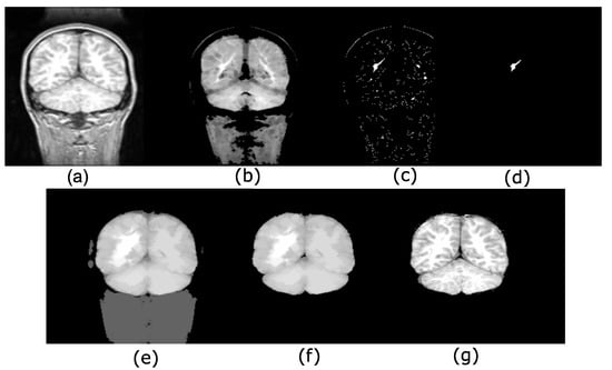 Maximum hyperconnectivity and ultimate connected viscous opening example. (a) Original image; (b) size . The morphological erosion separates brain and skull; (c) maxima detection; (d) maximum fulfilling the increasing criterion, i.e., the greater volume obtained of a max-tree branch; (e) ; (f) Otsu threshold to eliminate low-intensity levels; (g) mask with the original image.