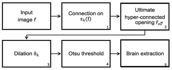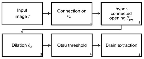 The proposals use hyperconnectivity [23], the max-tree [24], viscous transformations [25], and lower levelings [26]. To introduce morphological transformations, Section 2 provides some notions of morphological filtering, connectivity, and hyperconnectivity. Such concepts are explained in detail, and several images illustrate how they operate practically. Section 3 gives the mathematical formalism of the openings defined under the hyperconnectivity. The proposals given in this section are also explained widely to follow the ideas related to mathematical morphology. Section 3.1 shows the criterion based on the maxima of the image to detect the maximum hyperconnectivity, and Section 3.2 formalizes the use of lower leveling applied from the higher extreme. Section 4 illustrates the application of hyperconnected viscous transformations, which allow the skull stripping of the 38 MRI T1 images provided by the IBSR [27]. Once the brain is segmented, the indices of Jaccard and Dice [21,22] are computed and compared with the information obtained from the current literature. Section 5 corresponds to the conclusions.