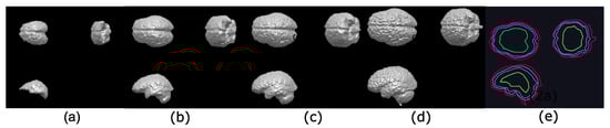 Illustration of the control in the reconstruction process by applying the hyperconnected lower leveling to the volume used in Figure 11 by varying the slope : (a) ; (b) ; (c) ; and (d) ; (e) contours illustrating the reconstruction process of the brain using the leveling, with, in green, in blue, in fuchsia, and in purple.