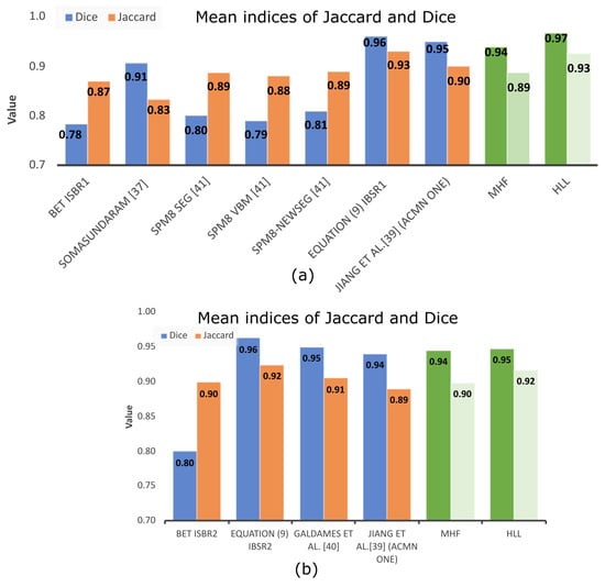 Jaccard and Dice indices computed for 38 volumes of an MRI obtained from the IBSR repository. The brain segmentation in this work utilizes the steps provided in Figure 8, and the computed indices are in columns MHF Jaccard and MHF Dice.
