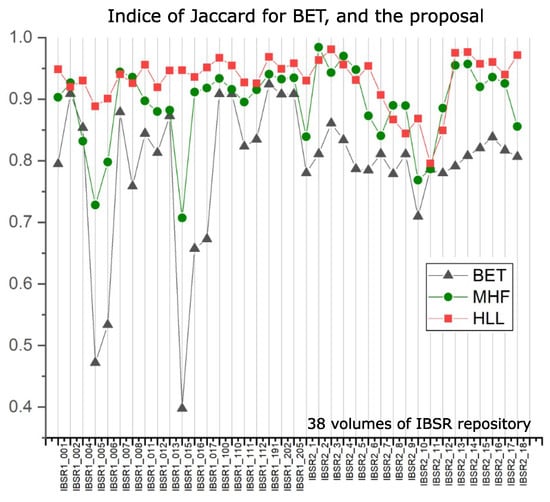 Our interest is evaluating the intersection with the ground truth images provided by databases utilized here. Table 1 displays such indices for the BET algorithm in columns “BET Jaccard” and “BET Dice”, and our results are in columns “MHF Jaccard” and “MHF Dice”. The data reported in Table 1 use 38 volumes of the IBSR repository, and they are plotted in Figure 15.