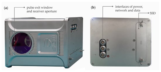 The appearance of the Mapper4000U; (a) the bottom of the system with the pulse exit window and receiver aperture for the near-infrared (NIR) and green laser; (b) the front side of the system with the interfaces and solid-state drive (SSD) socket.
