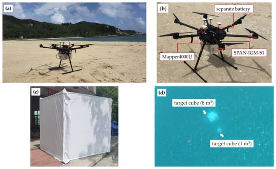 Photos of the Mapper4000U data acquisition and target placement; (a) Mapper4000U mounted on DJI Matrice 600 Pro; (b) detailed installation positions of the payloads; (c) a photo of the 2-m fabric cube; (d) an aerial image of the target cubes.