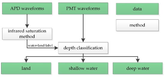 Based on the infrared saturation method [31], waveforms were first classified into two groups, land and water, using APD waveforms. In the infrared saturation method, the saturation time of the APD waveforms is defined as the duration beyond the maximum effective value (saturated value) of the receiver. The saturation time tSAT can be expressed as follows: