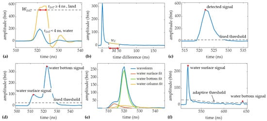 - Deep-water waveforms processing. Denoising is the key to deep water waveforms processing, while the existing waveform filtering methods cannot appropriately deal with the high-intensity noise in the water column scattering. Thus, the fixed threshold in the signal detection method is replaced by a depth-adaptive threshold derived from the truncated water column scattering waveform [27], which greatly reduces the effect of noise in the water column scattering. The intensities of the detected signal are subtracted from the depth-adaptive threshold, and the two signals with the highest strength are selected as the water surface and bottom signal, as shown in Figure 5f.
