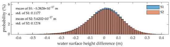 The errors of the water surface height are presented numerically in Table 4. The deviation between the mean water surface heights of S1 and S2 is 5.5 mm. The mean water level elevation (MWLE) in the study area at the time of the UAV survey is about −7.9478 m. The root mean square error (RMSE) of S1 is slightly lower than that of S2. The overall RMSE of the water surface height is below 0.13 m and 98% of the height errors are within ±0.3 m.