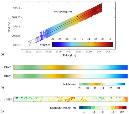 Comparison of water bottom height in the overlapping area; (a) color-coded map of the water bottom height of S1 and S2 with the overlapping area marked in the black box; (b) DBM1 and DBM2 in the overlapping area; (c) the height differences between the two strips in the overlapping area; DBM: digital bathymetric model.