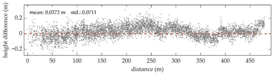 In Figure 8, a profile of the dDBM in the vertical direction is plotted. The DBM1 is averagely 2.72 cm higher than the DBM2, and the dispersion of the height difference is 7.11 cm. According to the DBM1 and DBM2 shown in Figure 7, the water depth decreases gradually from left to right, while the height differences of the water bottom rise first, then fall, and finally rise again. Thus, the trend of the height differences is not consistent with that of the water depths.