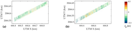 Figure 9 shows the spatial distribution of δB, where the right side is the water near the beach (i.e., the water depth gradually increases from right to left). The majority of the errors are negative, indicating that the ellipsoid height of the water bottom point is generally lower than the reference value. The water bottom points with large errors are mainly distributed in deep waters, especially in S2, where some water bottom points with the δB close to ±0.5 m exist. Comparing the error distributions of S1 and S2, it can be seen that the accuracy of S1 is higher, which is consistent with the precision assessment of the water surface height in Section 4.1.