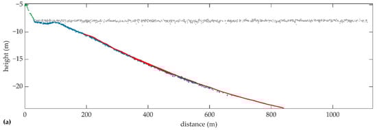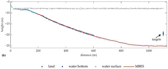 The profiles of the point clouds of S1 and S2 along the center of the strip are shown in Figure 10a,b, respectively, where all the target points are plotted as water bottom on the profile of S2 regardless of the distances to the profile. Most of the water bottom points are below the references, which is also observed in Figure 9 and Table 5. When the height is below −20 m, the error of the water bottom point increases significantly. The dispersion of the water bottom points in S2 is greater, which is consistent with the statistical results in Table 5. Both in S1 and S2, the land points and water bottom points at the land-water interface are well connected, and the topography is continuous with slight height differences. The depth of the targets is about 12 m, which exceeds the SD in the survey area.
