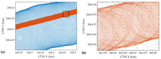 Distributions of water surface points acquired by the Mapper4000U (red dots) and the Mapper5000 (blue dots) on the XY plane; (a) the overall distribution; (b) the detailed distribution (zoom in the black box).