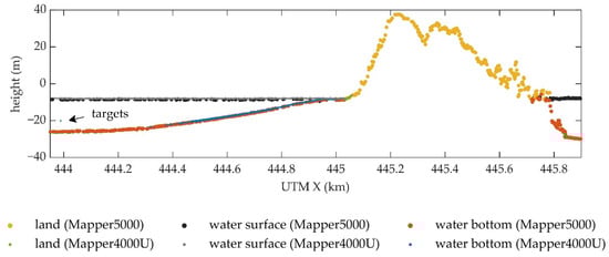 Figure 12 shows the cross-section of the point clouds of S2 and Mapper5000 strip along the track of S2. Both systems can acquire land, water surface, and water bottom points simultaneously. The MWLE varies slightly due to the different dates of data acquisition. The heights of the land and water bottom points obtained from the two platforms are very close. Most of the water bottom points obtained from the UAV are above those obtained from the manned aircraft. Since the overestimation of water depth in UAV data was found in Section 4.2, this problem is still present and even more serious in the manned platform data. Based on the heights of the water surface points, the MWLE at the time of the Mapper5000 survey can be estimated, and the result is −8.36 m. Since the minimum height of the water bottom points of Mapper5000 in the study area is −34.33 m, the maximum detectable depth of the system is 25.97 m, corresponding to 3 SD.