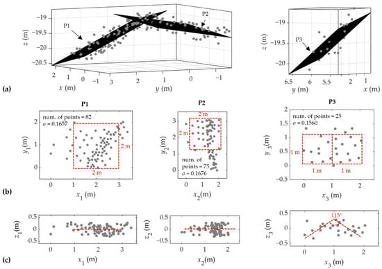 Results of the target points fitting; (a) perspective view of 3D point clouds of the 2-m target cube and 1-m target cube with the fitted planes P1–P3; (b) target points projected to P1–P3 with the dispersion of the point-to-plane distance (i.e., σ); (c) vertical section of the target points.