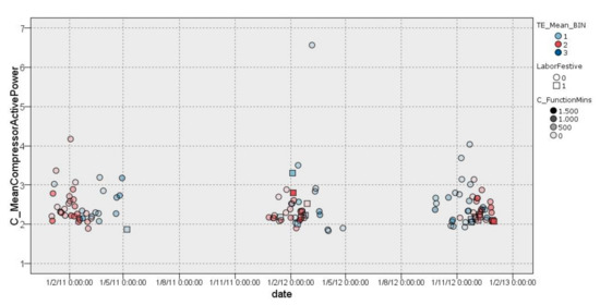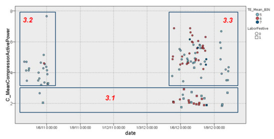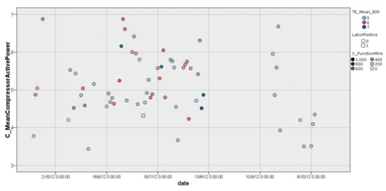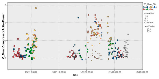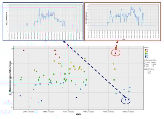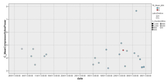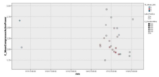 This EEI counts the number of daily ORCC periods and the number of minutes in which the daily ORCC periods occurred. An ORCC is defined as a change in the compressor power consumption greater than 0.5 kW with respect to the previous measurement (10 min). These parameters were specified based on the results of DM techniques under the consensus of Isotrol HVAC experts. Thus, a large number of operational regime changes in the HVAC compressor (ORCC) is considered abnormal or inefficient.