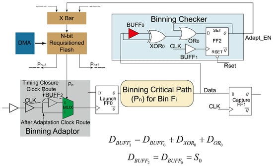 As shown in Figure 2, the Binning Checker is used to monitor the output of Binning Critical Path. The clock frequency of the critical path is the binning frequency . Assume the adaptable margin is , which is equal to the delay of inside the Binning Checker. To achieve Task 1, the two inputs of the gate come from the output of the critical path (node in Figure 2) and the critical path output signal through the , respectively. Thus, the gate outputs 1 if the data transit from 0 to 1 or 1 to 0 within . The gate and together form a “sticky” structure, which means that once outputs 1, the value of remains 1 until it is reset. Before binning optimization, all s in Binning Checker are reset. is composed by several buffer cells, and its delay is equal to the sum of the delay of , , and , as shown in Figure 2. Hence, can monitor data transition after the capture edge of within . If the (the output of Binning Critical Path) transition occurs within after the clock capturing, the output of Binning Checker () would turn to 1. means that (i) the delay of the Binning Critical Path is greater than , and (ii) the delay of Binning Critical Path is smaller than . To make the detected failing path recoverable, inside the Binning Checker needs to be the same as inside the Binning Adaptor (Figure 2). The Binning Adaptor is introduced in detail in Section 2.2. By employing the design above, Task 1 and 2 mentioned above are fully achieved.