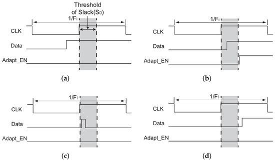 Figure 3 shows the output of under different transition conditions. In Figure 3a, the variable turns to 1 before clock capturing, which means that the monitored path does not cause binning failure at . Hence, the output of stays at 0. In Figure 3b, the variable turns to 1 within after clock capturing, which means that the monitored path is an adaptable Binning Critical Path. Thus, the output of turns to 1 to initiate adaptive binning. In Figure 3c, there is a glitch in after capturing. Then, the output of stays at 0 to avoid misjudgement and wrong adaptation. In Figure 3d, the moment that the variable turns to 1 is out of adaptable range, which means that the monitored path is an unadaptable Binning Critical Path. Thus, the output of stays at 0.